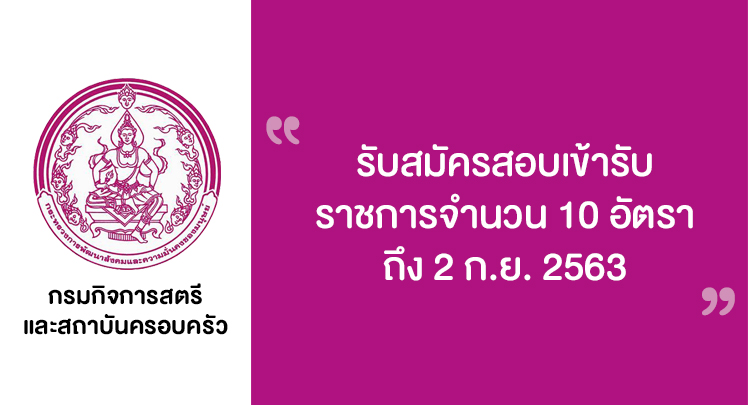 กรมกิจการสตรีและสถาบันครอบครัว เปิดรับสมัครสอบเพื่อบรรจุเข้ารับราชการ จำนวน 10 อัตรา รับสมัครทางอินเทอร์เน็ต ตั้งแต่วันที่ 10 สิงหาคม – 2 กันยายน 2563