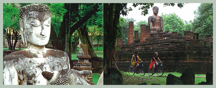 เส้นทางปั่นจักรยานสามารถลัดเลาะไปถึงแต่ละวัดได้อย่างใกล้ชิด วัดที่น่าสนใจ เช่น วัดช้างรอบ ที่มีจุดเด่น การสร้างช้างครึ่งตัวล้อมรอบฐานล่างเจดีย์ วัดพระนอน โดดเด่นด้วยเสาวิหารที่สร้างจากศิลาแลงขนาดใหญ่แท่งเดียวตลอดต้น วัดพระสี่อิริยาบถ ที่ตรงกลางมีแท่งสี่เหลี่ยมขนาดใหญ่ เว้า 4 ด้านประดิษฐานพระพุทธรูป ในอิริยาบถต่างกัน คือ เดิน นั่ง ยืน นอน ฯลฯ วัดส่วนใหญ่ทำมาจากศิลาแลง ใช้ศิลปกรรมที่ผสมผสานระหว่างล้านนา สุโขทัย และสกุลช่างกำแพงเพชร จึงทำให้ดูสวยแปลกตา ยิ่งถ้าได้มาหน้าฝนด้วยแล้ว ความสวยแปลกตาก็จะเด่นชัดมากขึ้น ด้วยพรมมอสที่ขึ้นแทรกตามก้อนอิฐรวมถึงดอกไม้เล็กๆที่น่ารัก