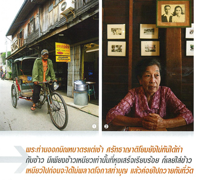1 ขี้เกียจปั่นจักรยานเองก็นั่งสามล้อให้พี่เค้าปั่นแทน 2 คุณยายทองคูณ เจ้าของโรงแรมรุ่นที่สอง ส่วนผู้หญิงที่เห็นในภาพแขวนคือเจ้าของรุ่นแรก 3 ผ้าห่มผืนนุ่มของขึ้นชื่อเชียงคานจะห่มอุ่นยิ่งขึ้นถ้าเราได้ลงมือทำเอง 4 เชียงคานเดินเที่ยวก็ทั่ว